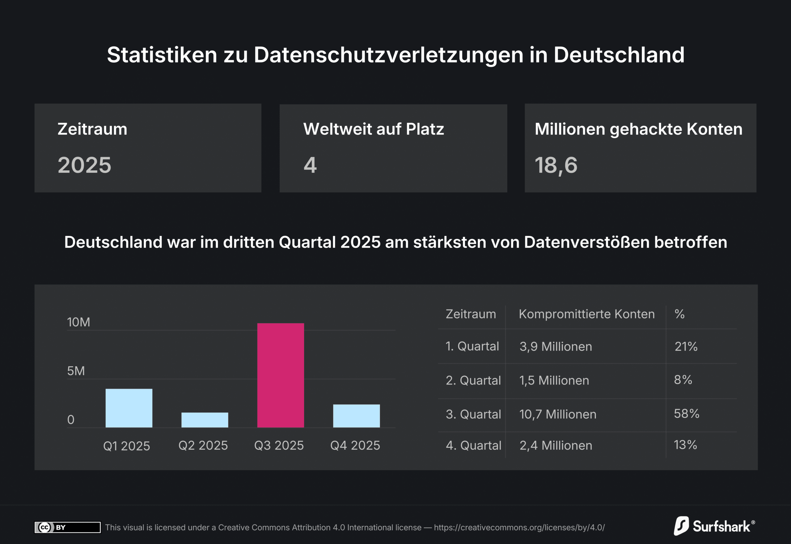 Für die Bundesrepublik erwies sich das dritte Quartal 2025 als kritischster Zeitraum mit 10,7 Millionen kompromittierten Konten. Dieser Verlauf unterscheidet sich vom internationalen Muster: Weltweit zeigte das vierte Quartal mit über 141,5 Millionen gehackten Konten die höchsten Werte – mehr als doppelt so viele wie im ersten Quartal mit knapp 70 Millionen.