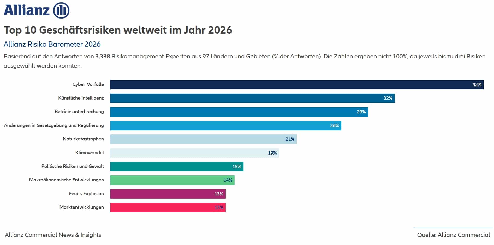 Cyberangriffe bleiben 2026 das dominierende Geschäftsrisiko für Unternehmen weltweit. Gleichzeitig gewinnt Künstliche Intelligenz deutlich an Relevanz und rückt im Allianz Risk Barometer auf den zweiten Platz vor. In Deutschland verschieben sich die Risikoschwerpunkte zusätzlich durch regulatorische Veränderungen.