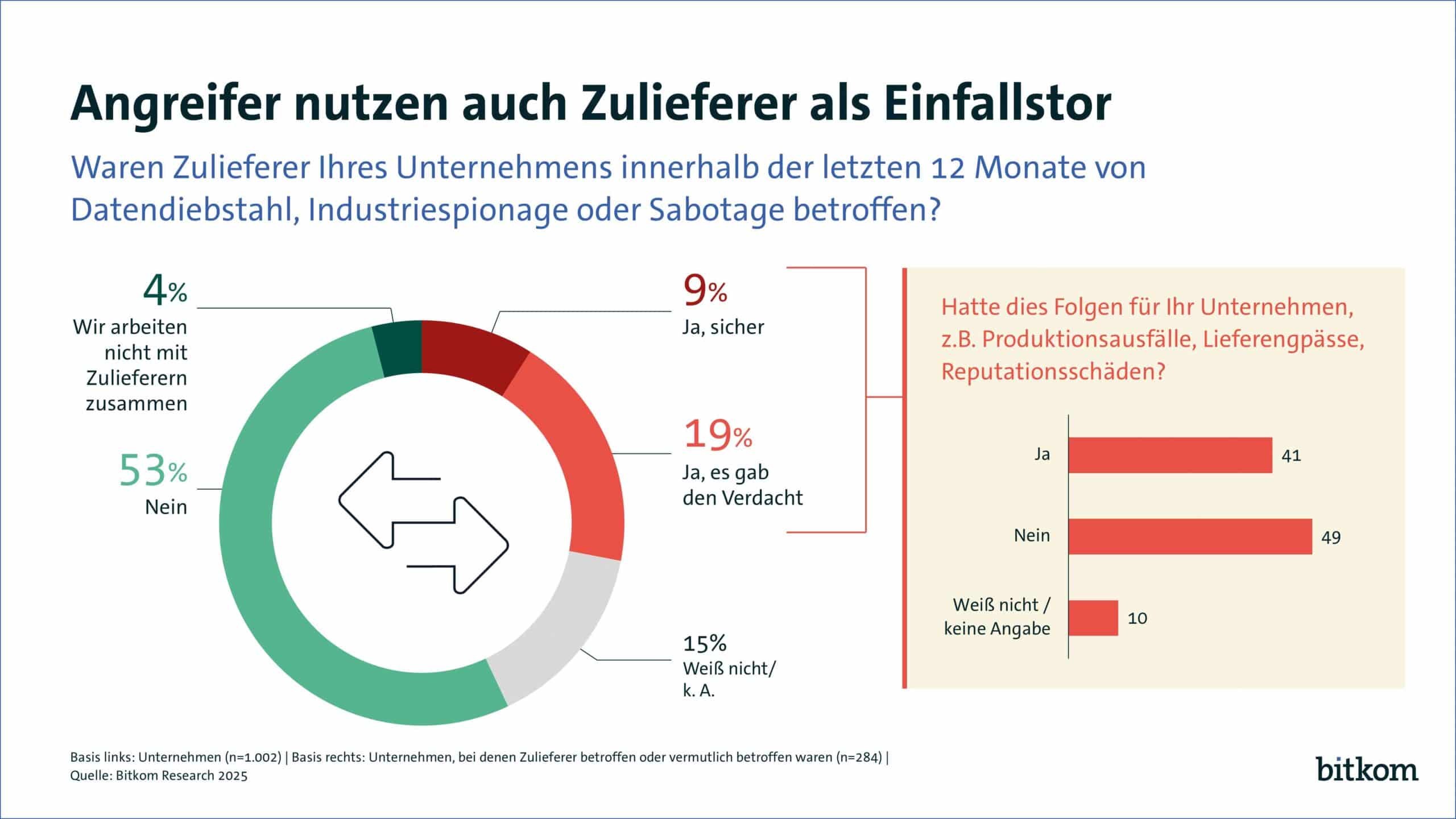 Die Studie zeigt zudem: Fast die Hälfte der Unternehmen, deren Zulieferer angegriffen wurden oder bei denen ein Verdacht besteht, spürte direkte Auswirkungen wie Produktionsausfälle, Lieferengpässe oder Reputationsschäden. 49 Prozent berichteten hingegen von keinen direkten Folgen, während 10 Prozent keine Angaben machten. Insgesamt gaben 53 Prozent der befragten Firmen an, dass ihre Zulieferer nicht Ziel von Angriffen waren.