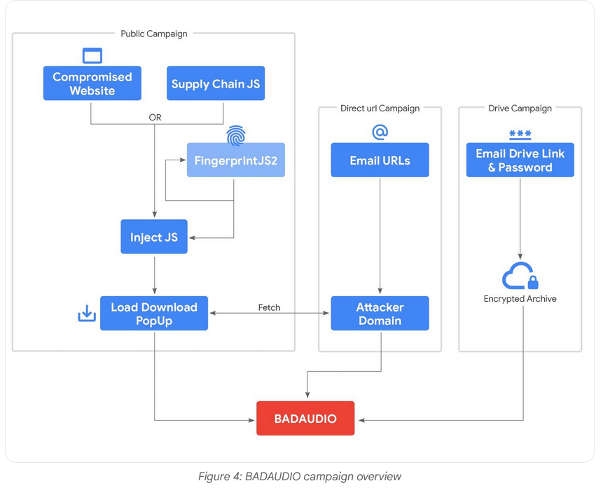 Weitere Kampagnen missbrauchten legitime Cloud-Plattformen wie Google Drive und OneDrive zur Verbreitung verschlüsselter BADAUDIO-Archive. Google konnte diese Angriffe durch automatisches Spam-Filtering abwehren.