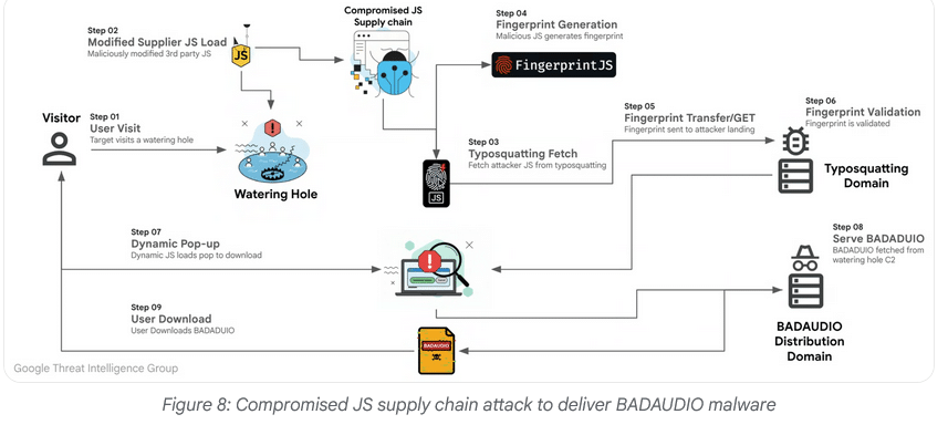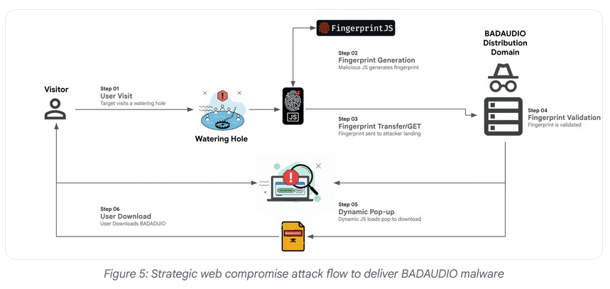 Der generierte Browser-Fingerabdruck diente als Selektionsmechanismus: Nur validierte Opfer erhielten gefälschte Popup-Fenster, die zum Download der BADAUDIO-Malware verleiteten. Die Angreifer wechselten kontinuierlich zwischen neu registrierten und zuvor kompromittierten Domains – eine Taktik, die bis September 2025 beobachtet wurde.