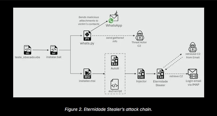 Sicherheitsforscher von Trustwave SpiderLabs warnen vor einer neuen Malware-Kampagne, die WhatsApp als Verbreitungskanal missbraucht. Der Banking-Trojaner „Eternidade Stealer“ kombiniert Social Engineering mit automatisierter Kontakt-Exfiltration und zielt primär auf brasilianische Bank- und Kryptowährungskunden ab. Die Angreifer setzen dabei auf eine hybride Angriffskette aus Python-Skripten, verschleierten VBScripts und einem in Delphi entwickelten Credential Stealer.