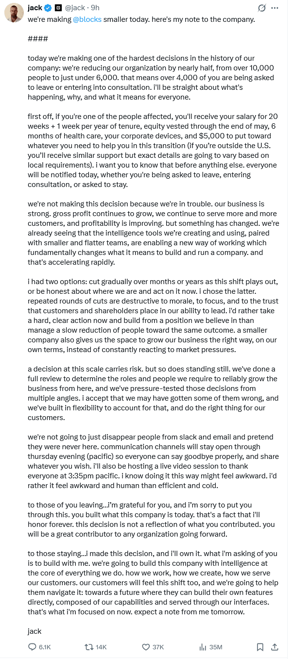 Dorsey schreibt, er habe zwei Optionen gehabt: den Personalabbau über Monate oder Jahre hinweg schrittweise zu vollziehen, während sich der Wandel vollzieht – oder offen zu benennen, wo das Unternehmen steht, und jetzt zu handeln. Er entschied sich für den zweiten Weg. Wiederholte Entlassungsrunden seien destruktiv für Moral, Fokus und das Vertrauen von Kunden und Investoren in die Führungsfähigkeit des Unternehmens. Ein klarer, einmaliger Schnitt sei einem langsamen Abbau vorzuziehen.