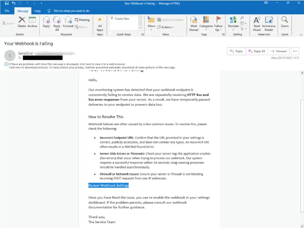 Um an die Anmeldedaten zu gelangen, versandten die Angreifer an Unternehmen unterschiedlicher Branchen E-Mails mit dem Betreff „Your Webhook is Failing”– meist an Mitarbeiter der jeweiligen IT-Abteilung. Um die wahre Absenderadresse zu verschleiern, wählten sie ‚SendGrid‘ als Absendername. In der E-Mail selbst stand dann, dass ein SendGrid-Webhook auf Kundenseite fehlgeschlagen sei. SendGrid habe keine Daten empfangen können. Es folgten detaillierte Anweisungen zur Diagnose des angeblichen Problems und – am Ende der Nachricht – ein als Verknüpfung zu den Webhook-Einstellungen getarnter Phishing-Link.
