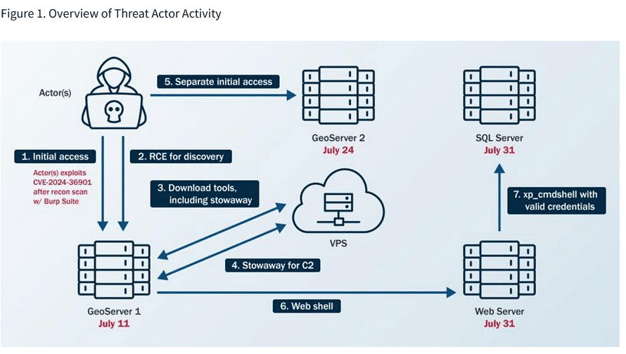 Nachdem sie sich zunächst Zugang zu GeoServer 1 verschafft hatten, erlangten die Cyber-Angreifer am 24. Juli 2024 durch Ausnutzung derselben Schwachstelle separaten Zugang zu einem zweiten GeoServer (GeoServer 2). Sie bewegten sich lateral von GeoServer 1 zu einem Webserver (Web Server) und dann zu einem Structured Query Language (SQL)-Server. Auf jeden Server luden sie Web-Shells wie China Chopper hoch (oder versuchten dies) sowie Skripte für Fernzugriff, Persistenz, Befehlsausführung und Privilegieneskalation. Die Cyber-Angreifer verwendeten auch Living-off-the-Land-Techniken (LOTL).