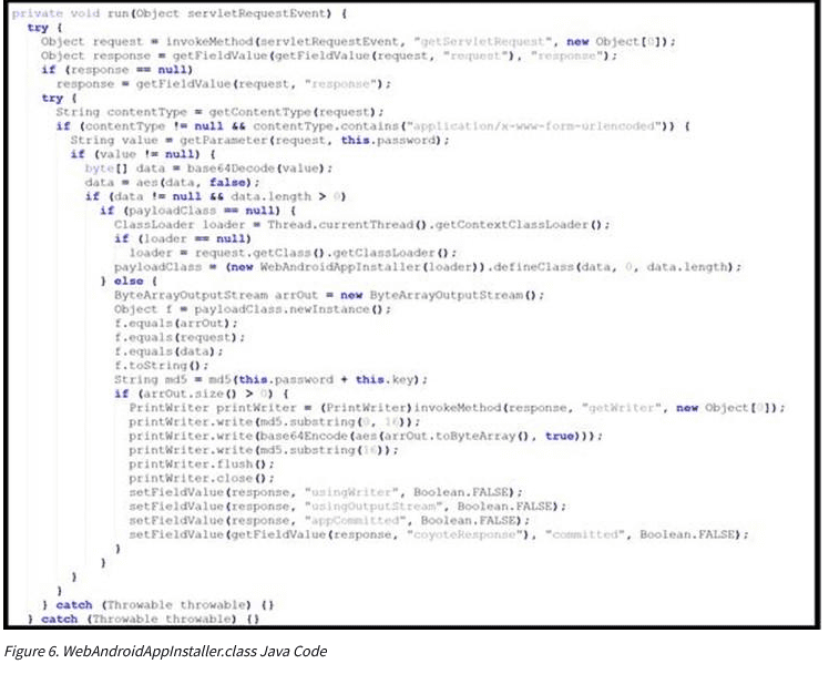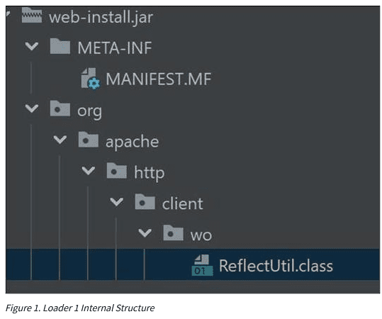 Die Schadsoftware besteht aus zwei Komponenten: Loader 1 (web-install.jar, ReflectUtil.class, SecurityHandlerWanListener.class) und Loader 2 (web-install.jar, WebAndroidAppInstaller.class). Beide dienen dazu, beliebigen Code einzuschleusen und die Persistenz auf Apache Tomcat-Installationen aufrechtzuerhalten.