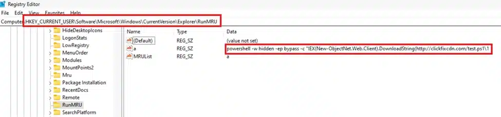 Ausführen des Registrierungsschlüssels „RunMRU“ mit einem bösartigen ClickFix-Befehl