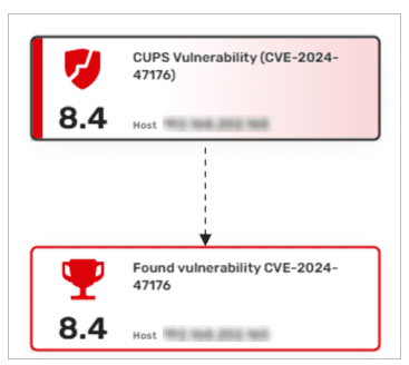 Pentera kann dieses weit verbreitete CVE erkennen. Sie werden es in der Angriffskarte als Schwachstelle – 8.4 CUPS-Schwachstelle – und als Erfolg 8.4 Gefundene Schwachstelle CVE-2024-47176 entdecken.