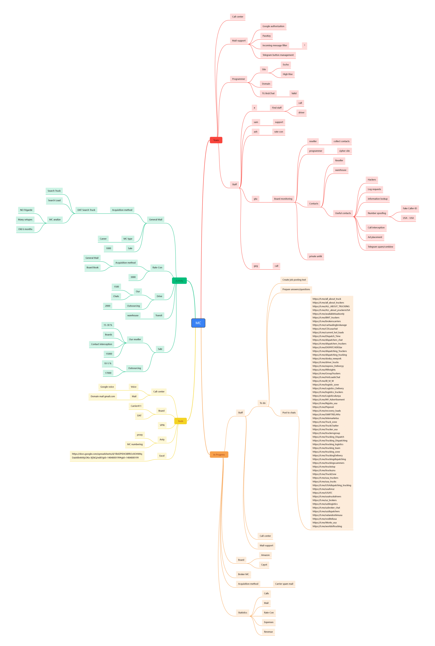 Parallel dazu enthielt das Repository eine 3,5 Megabyte große Protokolldatei mit Telegram-Webhook-Rohdaten, die nahezu sämtliche Interaktionen der Betreiber mit ihrer eigenen Infrastruktur über den gesamten Kampagnenzeitraum dokumentierte. Eingebettet in diesen Datensatz war ein Link zu einer noch aktiven Mindmap, die den vollständigen Operationsplan der Gruppe abbildete. Diese Karte umfasste definierte funktionale Rollen wie Callcenter, Programmierer, E-Mail-Support und spezialisierte Mitarbeiter für die Anwerbung von Fahrern und Logistikpartnern, dazu Akquisitionskanäle, Umsatzkategorien sowie eine detaillierte Liste gezielt infiltrierter Telegram-Gruppen aus dem Transportbereich. Die Karte enthielt auch Verweise auf Wiederverkäufer und Outsourcing-Vereinbarungen – ein Hinweis auf eine arbeitsteilige, unternehmerisch strukturierte Organisation.