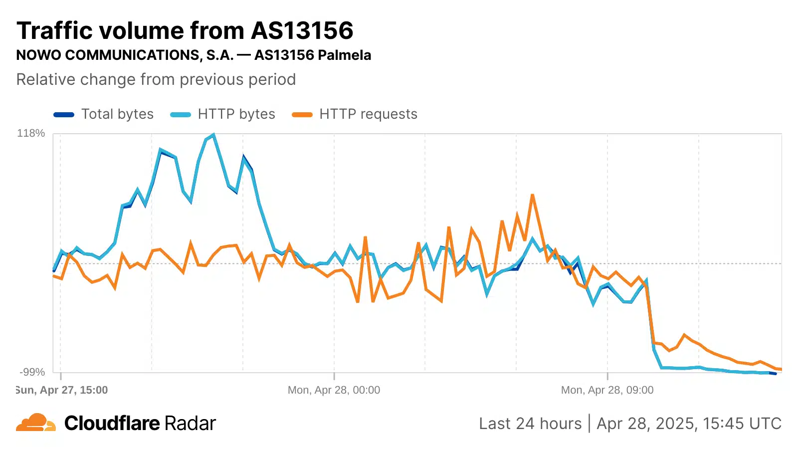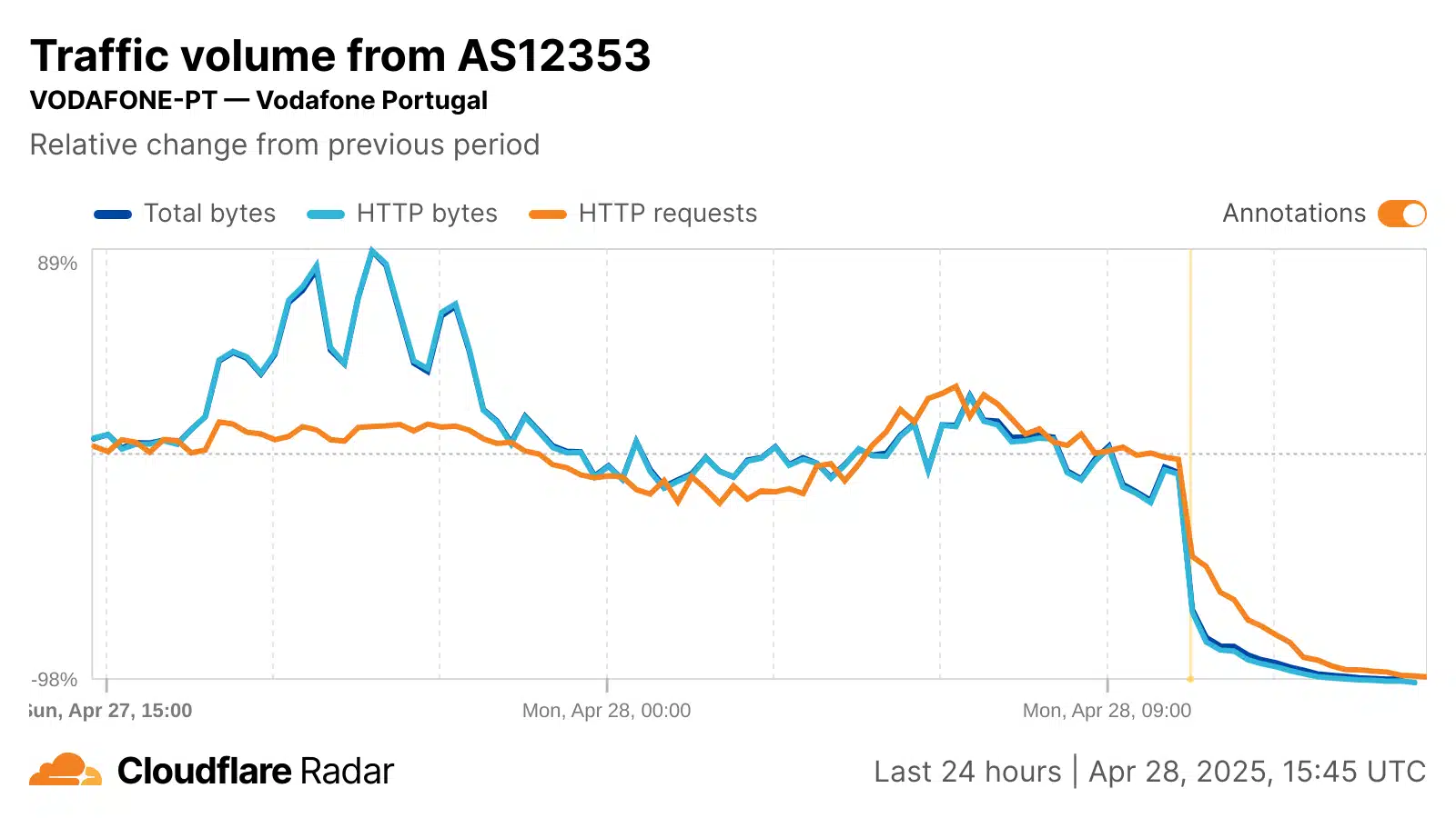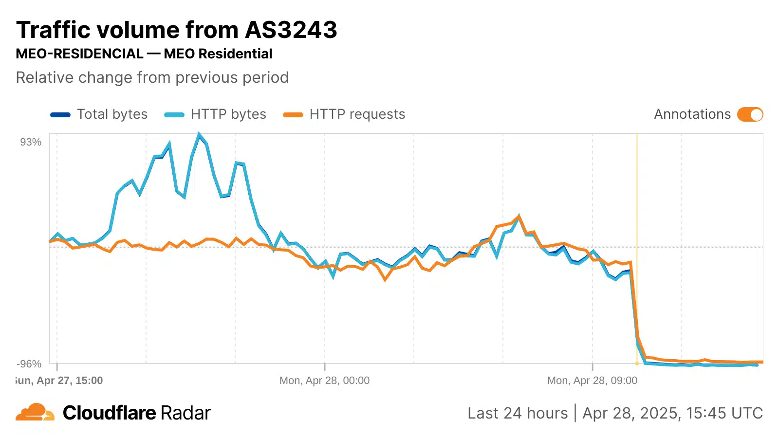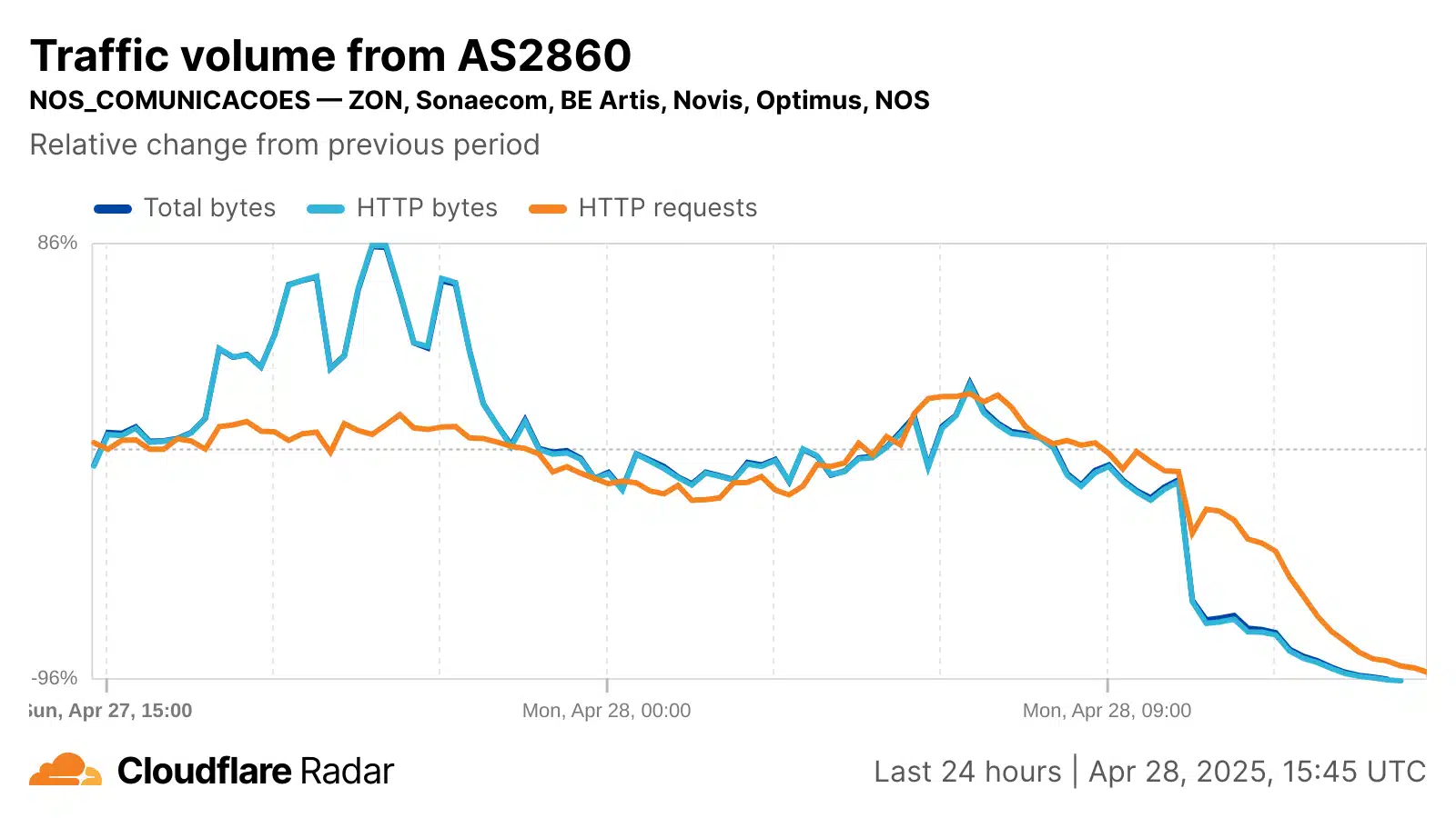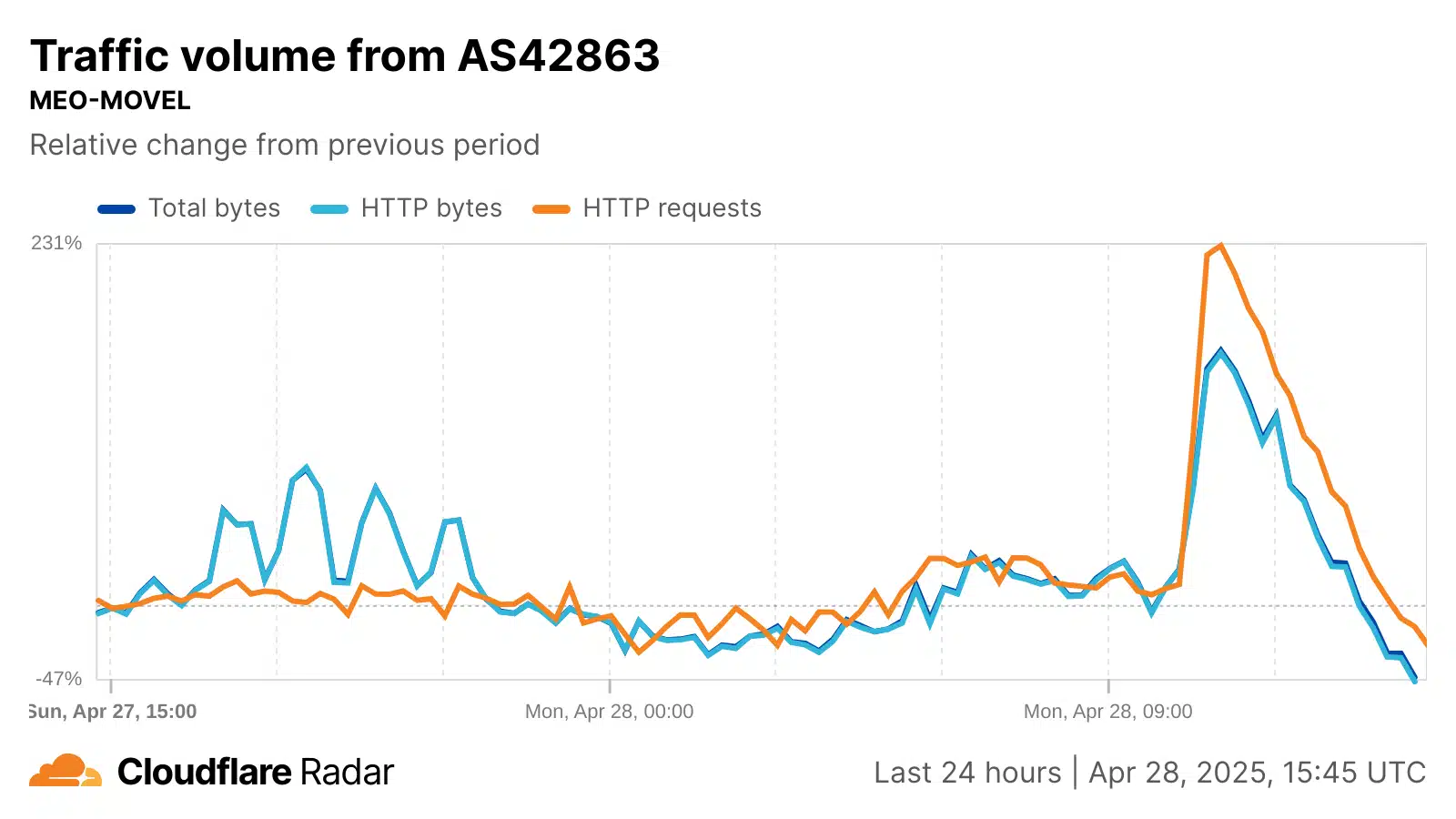 Auf Netzwerkebene war der Verlust des Internetverkehrs von lokalen Anbietern wie NOS, Vodafone, MEO und NOWO schnell und erheblich. Die folgenden Cloudflare-Radargrafiken zeigen, dass der Datenverkehr aus diesen Netzwerken innerhalb weniger Stunden nach Beginn des Stromausfalls praktisch vollständig zum Erliegen kam. Die unten aufgeführten autonomen Systeme (ASNs) dieser Anbieter können eine Mischung aus festem und mobilem Breitbanddatenverkehr übertragen. MEO leitet jedoch zumindest einen Teil seines mobilen Datenverkehrs auf ein separates ASN um, und die Grafik unten für MEO-MOVEL (AS42863) zeigt, dass sich der Anfrageverkehr aus diesem Netzwerk nach dem Stromausfall mehr als verdoppelt hat, da die Teilnehmer ihre Mobilgeräte nutzten, um Informationen über die Geschehnisse zu erhalten. Trotz des anfänglichen Anstiegs ging dieser mobile Datenverkehr in den folgenden Stunden jedoch wieder zurück und sank auf etwa die Hälfte des Volumens der Vorwoche.