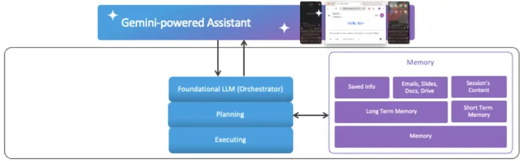 Die Anwendungen von Gemini basieren auf grundlegenden LLM wie Flash2.0, um eine Benutzeranfrage zu analysieren. Das grundlegende LLM selbst ist ein KI-Agent – den man als Orchestrator betrachtet –, der die Anfrage in eine Reihe von Tests aufteilt, die wir als Planungsschritt betrachten. Darauf folgt eine Ausführungsphase, die vom Orchestrator abgeschlossen wird.