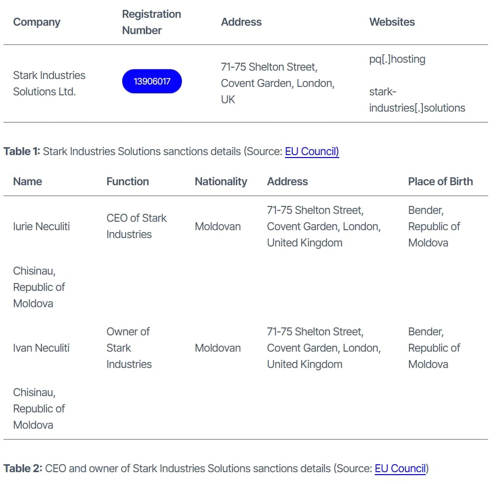 Am 20. Mai 2025 verhängte der Rat der Europäischen Union Sanktionen gegen den Internetdienstanbieter (ISP) Stark Industries sowie dessen CEO Iurie Neculiti und Eigentümer Ivan Neculiti. Die Insikt Group verfolgt Stark Industries und seine Muttergesellschaft PQ.Hosting als TAE, die eine Vielzahl von staatlich geförderten Cyberoperationen im Zusammenhang mit Russland, Iran, Nordkorea und China sowie cyberkriminellen Gruppen ermöglichen. Die Insikt Group stellt fest, dass PQ.Hosting zwar neben Stark Industries mehrfach in den Sanktionen erwähnt wurde, das Unternehmen selbst jedoch nicht sanktioniert wurde. Einzelheiten zu den sanktionierten Unternehmen und Personen sind in den Tabellen 1 und 2 aufgeführt.