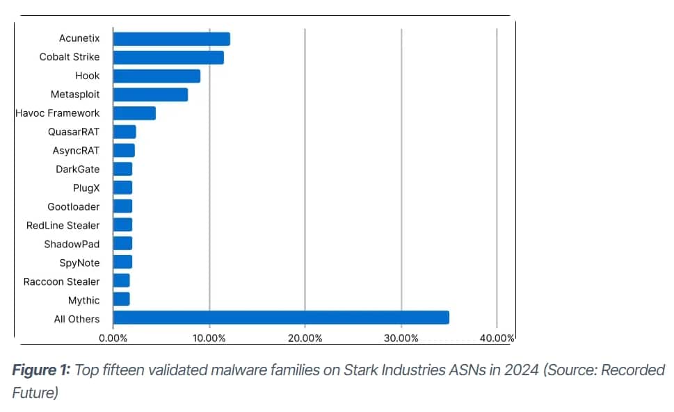 Nach Ausbruch des Krieges in der Ukraine wurde Stark Industries schnell zu einer zentralen Plattform für bedeutende Distributed-Denial-of-Service-Angriffe (DDoS) der Hacktivisten-Gruppe NoName057(16). Darüber hinaus wurde die Infrastruktur von Stark Industries Anfang 2024 als zentral für das Wiederaufleben des finanziell motivierten Bedrohungsakteurs FIN7 hervorgehoben. Noch Mitte 2025 beobachtete die Insikt Group, dass GrayAlpha, ein Bedrohungscluster mit erheblichen Überschneidungen mit FIN7, weiterhin auf die Infrastruktur von Stark Industries angewiesen war.
