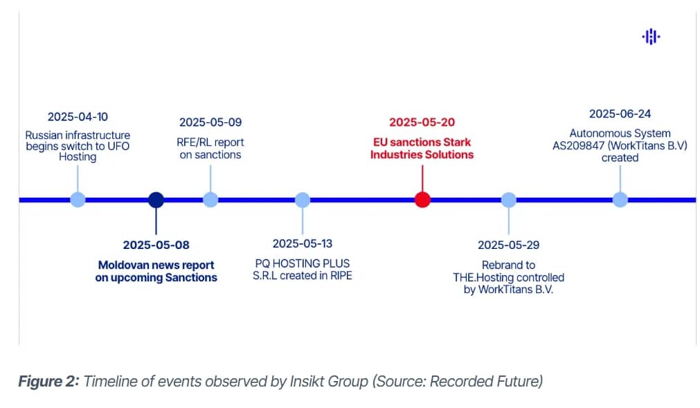 Die Insikt Group schließt daraus, dass UFO Hosting als Plattform für die russische Infrastruktur und Kundschaft von Stark Industries diente und eine sanktionsresistente Umgebung schuf, die eine diskrete Migration von Vermögenswerten und die Aufrechterhaltung des Betriebs vor der EU-Durchsetzung ermöglichte.