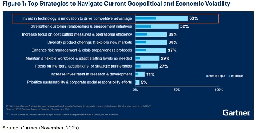63 % der NEDs gaben an, dass Investitionen in Technologie und Innovation der beste Weg sind, um der heutigen globalen Volatilität entgegenzuwirken (siehe Abbildung 1).