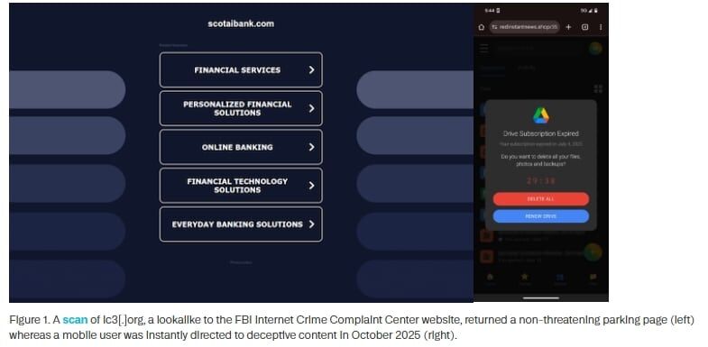 Abbildung 1. Ein Scan von ic3[.]org, einer Website, die der Website des FBI Internet Crime Complaint Center ähnelt, ergab eine harmlose Parkseite (links), während ein mobiler Nutzer im Oktober 2025 sofort zu betrügerischen Inhalten weitergeleitet wurde (rechts).