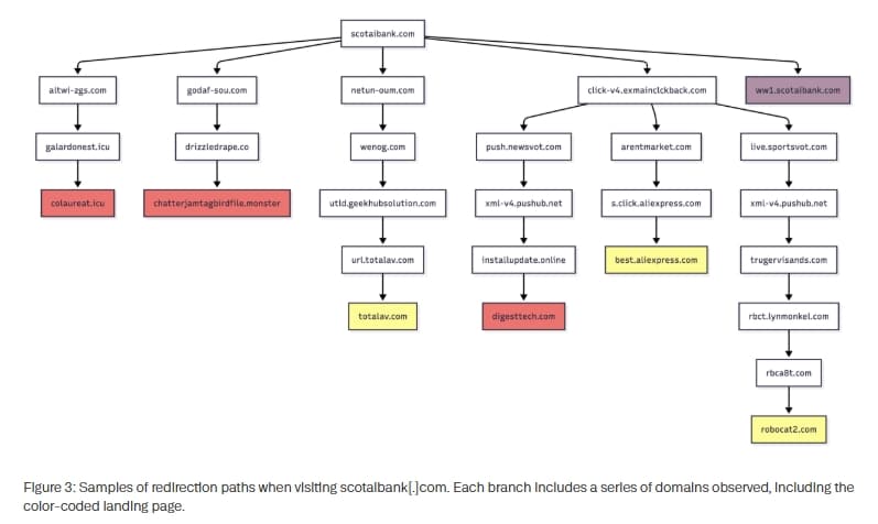 Abbildung 3: Beispiele für Umleitungswege beim Besuch von scotaibank[.]com. Jeder Zweig enthält eine Reihe von beobachteten Domänen, einschließlich der farbcodierten Landing Page.
