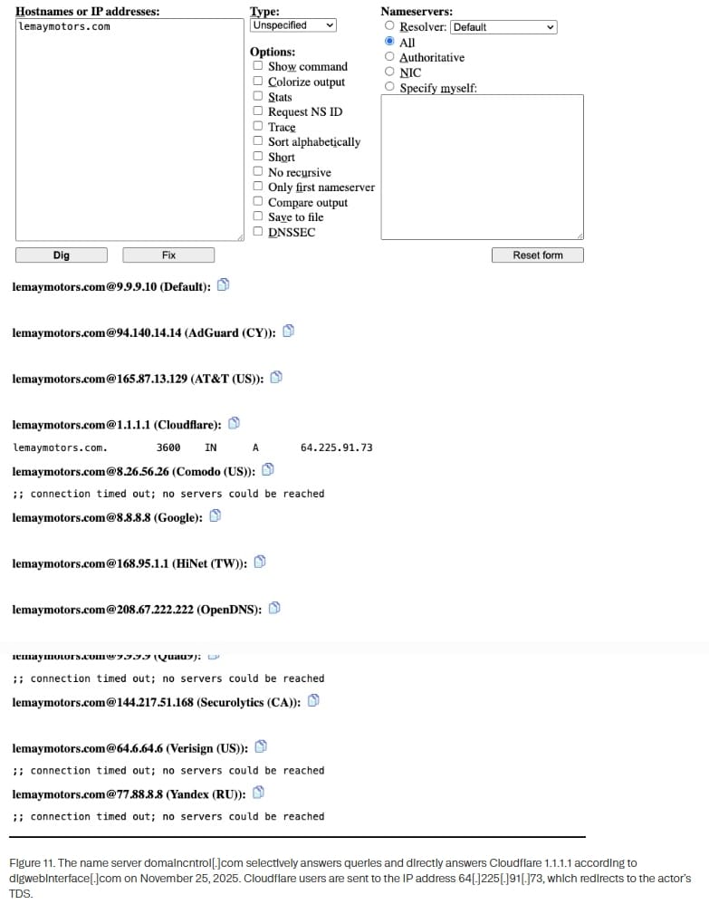 Abbildung 11. Der Nameserver domaincntrol[.]com beantwortet Anfragen selektiv und antwortet laut digwebinterface[.]com am 25. November 2025 direkt auf Cloudflare 1.1.1.1. Cloudflare-Benutzer werden an die IP-Adresse 64[.]225[.]91[.]73 weitergeleitet, die zum TDS des Akteurs umleitet.