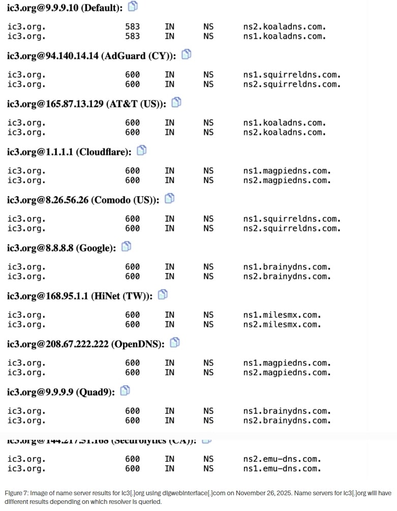 Abbildung 7: Bild der Nameserver-Ergebnisse für ic3[.]org unter Verwendung von digwebinterface[.]com am 26. November 2025. Die Nameserver für ic3[.]org liefern unterschiedliche Ergebnisse, je nachdem, welcher Resolver abgefragt wird.