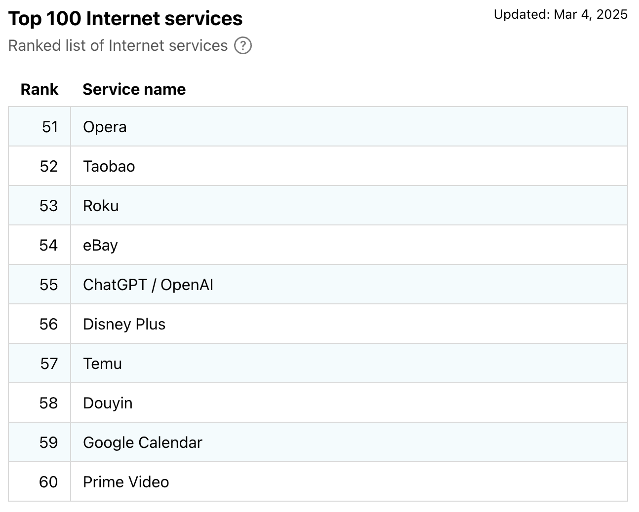 Eine aktuelle Ergänzung zu Cloudflare Radar ist die aktualisierte Seite zur Domain-Rangfolge in unserem DNS-Bereich, die eine Reihe detaillierter Trends enthält. Dort zeigen wir nun die Top 100 der Gesamtwertung der Internetdienste neben einer Top-100-Domain-Liste an. ChatGPT/OpenAI, der führende Dienst für generative KI, rangiert an Wochentagen in der Regel auf Platz 50 und am Wochenende auf Platz 60 (basierend auf Erkenntnissen von Anfang März 2025), neben Nicht-KI-Diensten wie Temu, eBay oder Disney Plus.