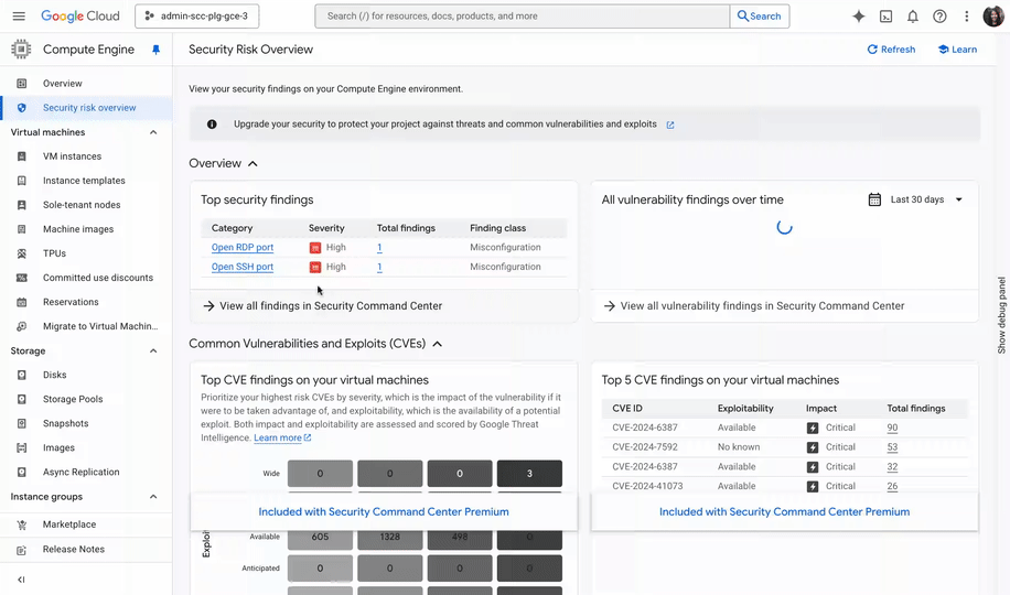 Bestimmte Funktionen, darunter die Widgets „Sicherheitsergebnisse“ (GCE) und „Workload-Konfigurationen“ (GKE), sind ohne Einschränkung verfügbar. Für weitergehende Analysen zu Schwachstellen und Bedrohungen empfiehlt Google ein Upgrade auf Security Command Center Premium, das als 30-tägige Testversion bereitsteht.