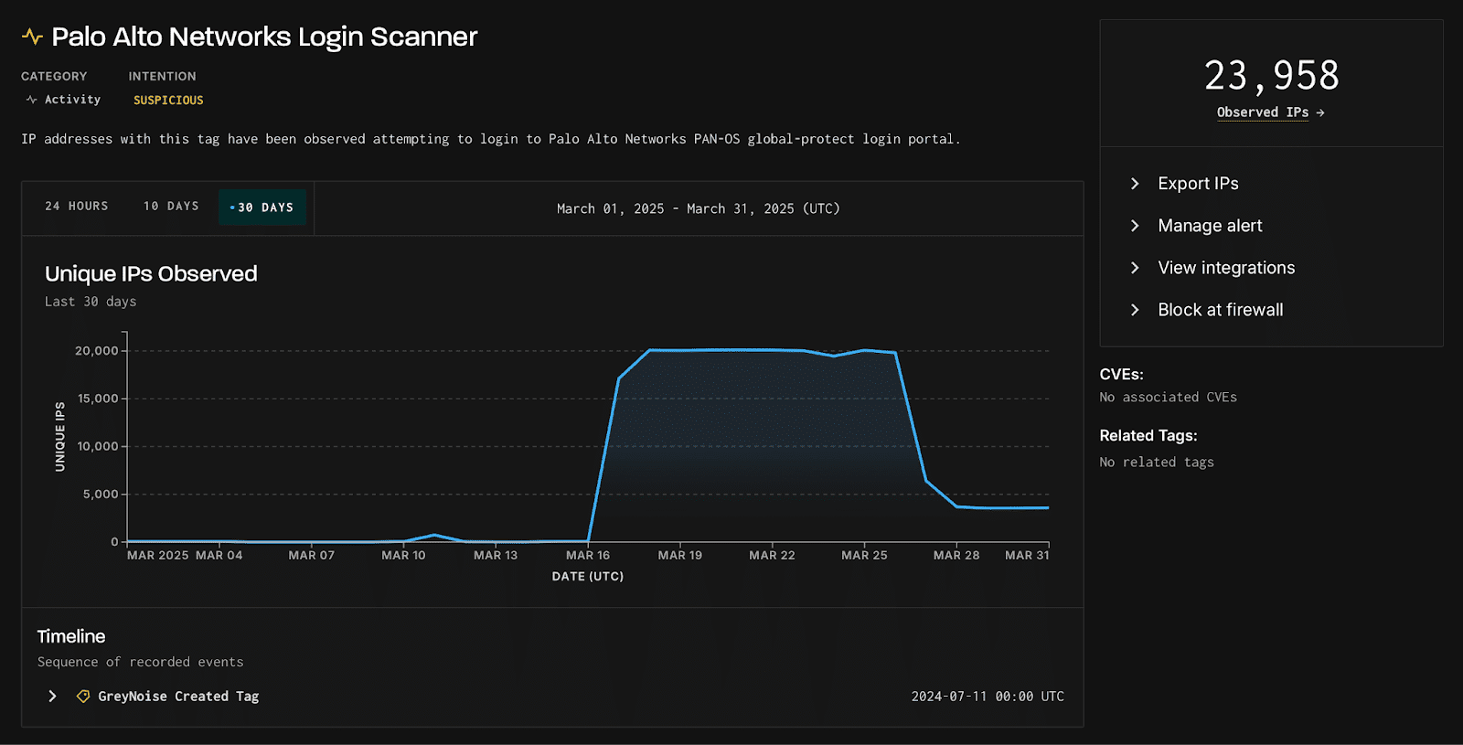 Anstieg der Scanner-Aktivität von Palo Alto Networks deutet auf mögliche bevorstehende Bedrohungen hin + GreyNoise hat einen deutlichen Anstieg der Anmelde-Scan-Aktivität beobachtet, die auf Palo Alto Networks PAN-OS GlobalProtect-Portale abzielt. In den letzten 30 Tagen haben fast 24.000 eindeutige IP-Adressen versucht, auf diese Portale zuzugreifen. Das Muster deutet auf eine koordinierte Anstrengung hin, die Netzwerkverteidigung zu testen und exponierte oder anfällige Systeme zu identifizieren, möglicherweise als Vorstufe für eine gezielte Ausnutzung.