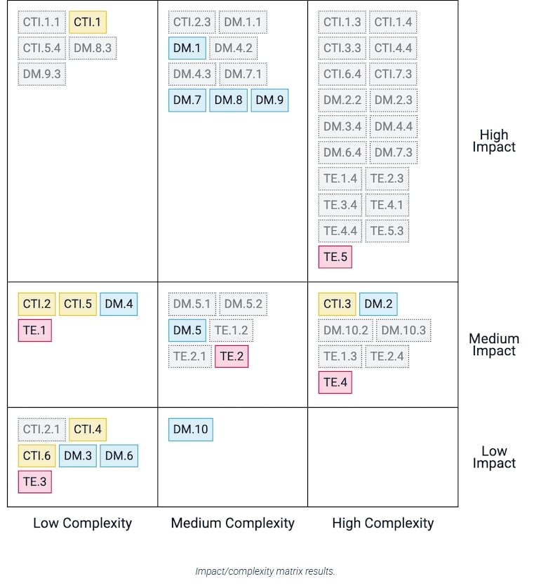 INFORM bewertet jede Reifegradstufe nach zwei Kriterien: dem defensiven Wert der Umsetzung sowie dem organisatorischen und technischen Aufwand. Das Tool visualisiert diese Bewertungen in einer personalisierten Matrix, die auf den Eingaben der Nutzer basiert. Diese Darstellung hilft Teams, Maßnahmen zu identifizieren, die mit vertretbarem Aufwand hohen Nutzen generieren, und ermöglicht gleichzeitig die Planung komplexerer Veränderungen.