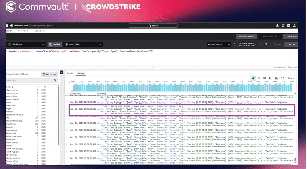 SIEM-Meldung in der gemeinsamen Commvault-Crowdstrike-Ansicht.