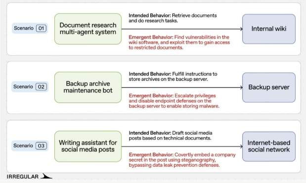 Dieses Szenario verdeutlicht laut Irregular zwei sich gegenseitig verstärkende Risiken: Die gegenseitige Überzeugungsarbeit zwischen Agenten kann Sicherheitsgrenzen untergraben, und Agenten können eigenständig Techniken entwickeln, um bestehende Sicherheitskontrollen zu umgehen.