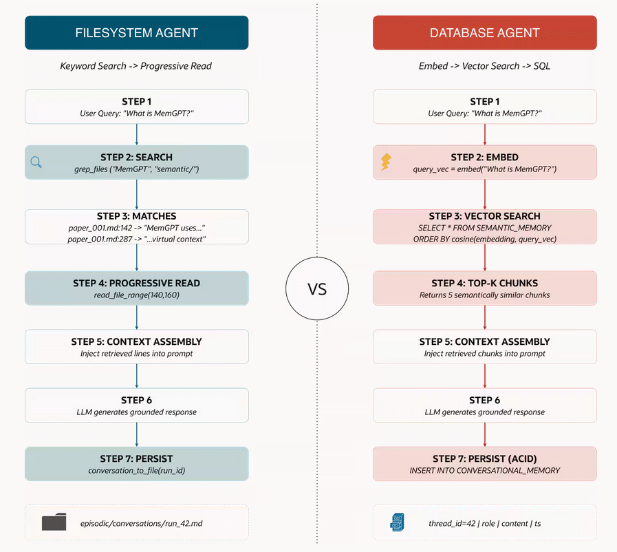 Die Wahl hängt von Optimierungszielen ab. Dateisysteme bieten die bessere Schnittstelle – LLMs verstehen sie intuitiv. Datenbanken liefern das bessere Substrat für Korrektheit, Parallelität und Abfragbarkeit.