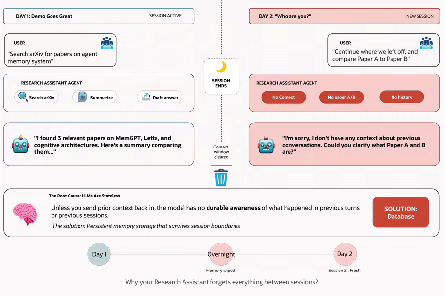 Sprachmodelle arbeiten zustandslos – ohne externen Speicher verlieren sie nach jeder Sitzung alle Informationen. Sobald Aufgaben mehrere Durchläufe erfordern oder verschiedene Nutzer zusammenarbeiten, wird persistenter Speicher notwendig.
