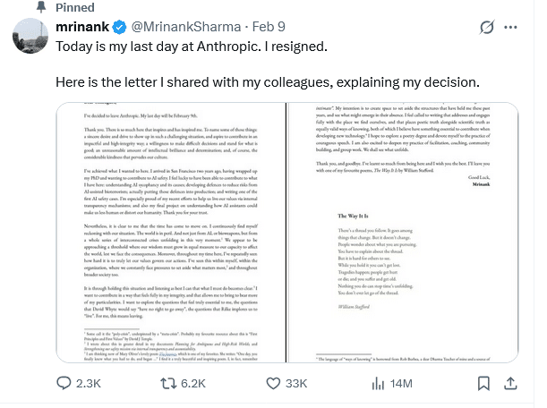 In einem auf X veröffentlichten Brief erklärte ein Sharma benannter Forscher seinen Rücktritt von Anthropic. Er habe erreicht, was er wollte, müsse sich jedoch ständig mit der Tatsache auseinandersetzen, dass „die Welt in Gefahr“ sei. Dies beziehe sich nicht nur auf KI oder Biowaffen, sondern auf eine Reihe miteinander verbundener Krisen.