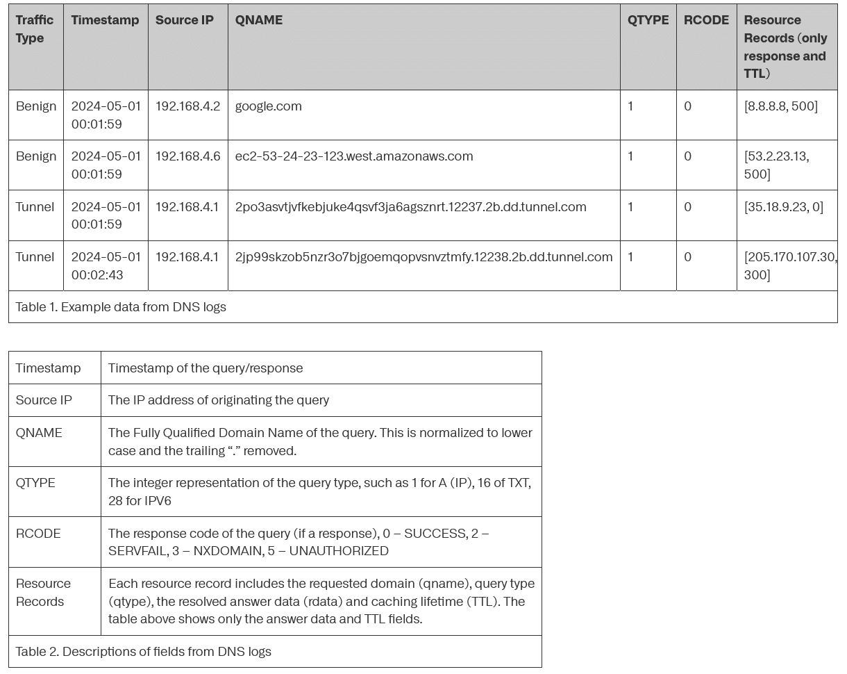 Der Datensatz böswilliger Proben umfasst Hunderttausende DNS-Tunneling-Anfragen aus weit verbreiteten Open-Source-Frameworks wie Pupy, DNSCat2, Sliver, Iodine und Cobalt Strike sowie speziell entwickelte Implementierungen. Diese wurden durch verschiedene Erfassungsmethoden zusammengetragen: Einsatz früherer Erkennungsalgorithmen in Produktivumgebungen, retrospektive Analyse historischer Netzwerkdaten und kontrollierte Sandbox-Ausführungen.