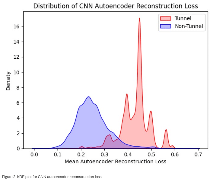 Bei der Auswertung zeigt normaler Verkehr niedrigen Rekonstruktionsverlust, während Tunneling-Aktivitäten durch hohe Verlustwerte auffallen. Verschlüsselte oder zufällig generierte Daten in Tunneling-Präfixen – etwa „2po3asvtjvfkebjuke4qsvf3ja6agsznrt“ – können vom Autoencoder nicht rekonstruiert werden, was zu charakteristisch erhöhten Verlustwerten führt.