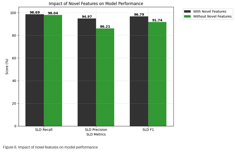 Eine Ablationsstudie quantifiziert den Beitrag der entwickelten Merkmale. Das Entfernen von Autoencoder-Rekonstruktionsverlust und Wortsegmentierungsverhältnissen führt zu erheblichen Leistungseinbußen: Die Präzision auf SLD-Ebene sinkt von 95 auf 86 Prozent, die Wiederauffindungsrate von 99 auf 98 Prozent. Der F1-Wert fällt von 97 auf 92 Prozent.