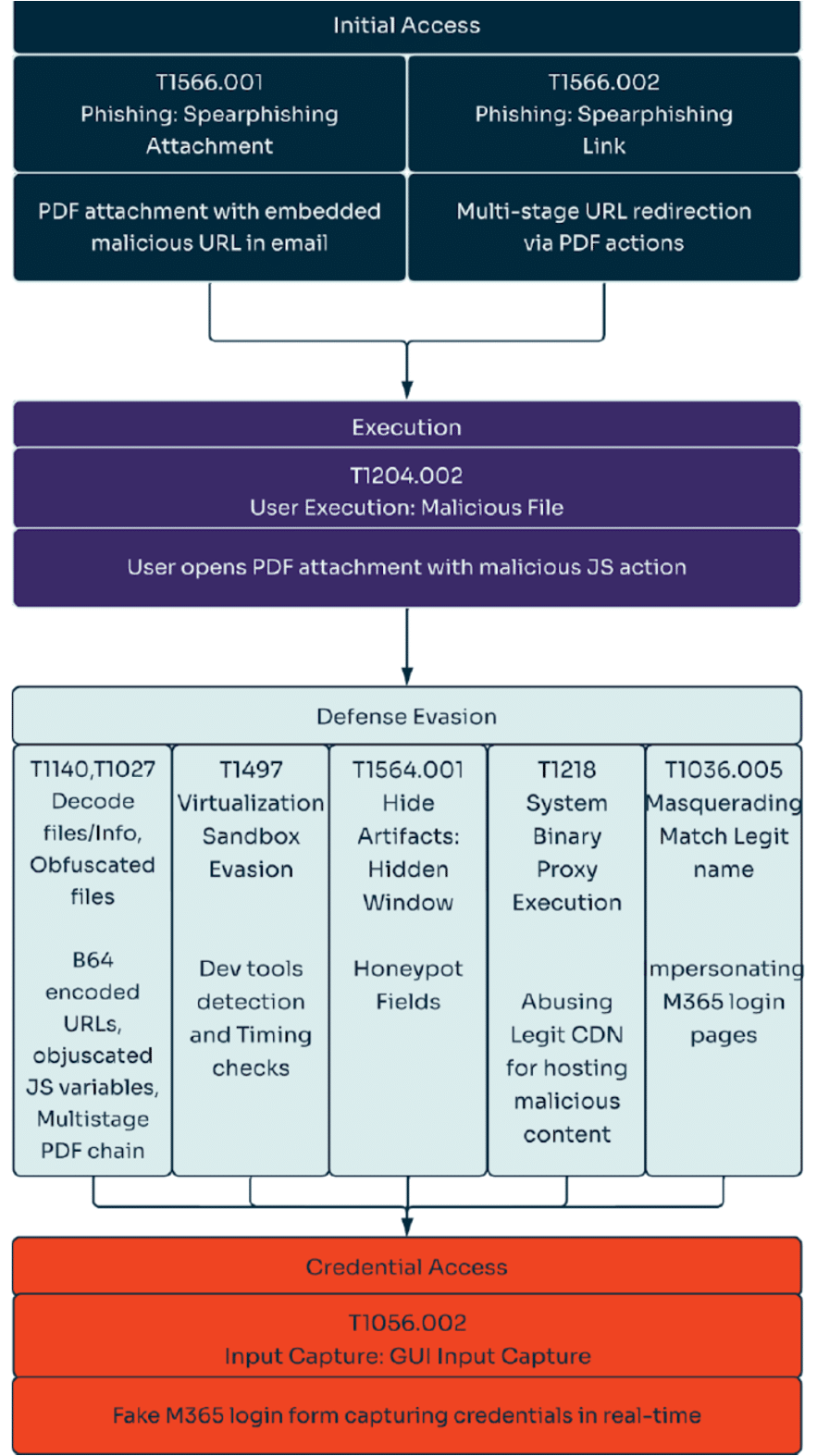 Zunächst erhalten die Opfer eine Phishing-E-Mail. Die Nutzlast – ein Phishing-Hyperlink – ist auf ihr in „verschachtelten” PDF-Anhängen versteckt. Wenn ein Opfer den ersten Anhang der Phishing-E-Mail öffnet, sieht es ein gerendertes Dokument mit einem weiteren Hyperlink, auf den es klicken kann. Sobald es auf diesen Hyperlink klickt, wird er zu einem zweiten Dokument weitergeleitet, das einen weiteren Hyperlink enthält. Diese Schichtung von PDF-Anhängen dient dazu, das endgültige Ziel – die eigentliche Phishing-Webseite – vor den Sicherheitstools des Opfers zu verbergen. Aufgrund technischer Einschränkungen oder Service Level Agreements (SLAs) für die E-Mail-Zustellung (Latenz) können diese keine aufeinanderfolgenden Sprünge zwischen den verschiedenen Hyperlinks durchführen. Zusätzlich wird die schädliche Nutzlast durch legitime und vertrauenswürdige CDN-Dienste maskiert, die bei der Überprüfung durch Sicherheits-Tools als „harmlos“ erscheinen.