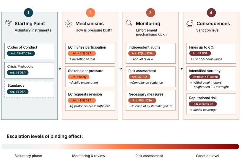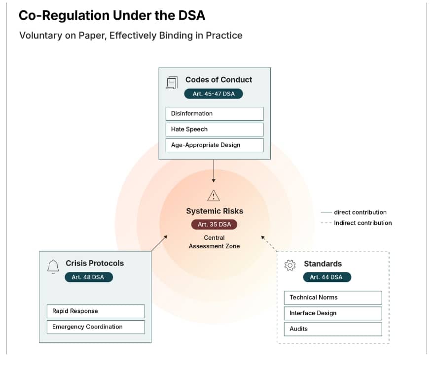 Koregulierungsinstrumente verbinden dabei „weiche“ und „harte“ Regeln: Sie sollen den Plattformen erlauben, ihre Pflichten innerhalb eines flexiblen Rahmens zu erfüllen, während die Kommission die Einhaltung überwacht. Ziel ist ein dynamischer Regulierungsansatz, der sich an die sich schnell verändernde Tech-Landschaft anpasst.