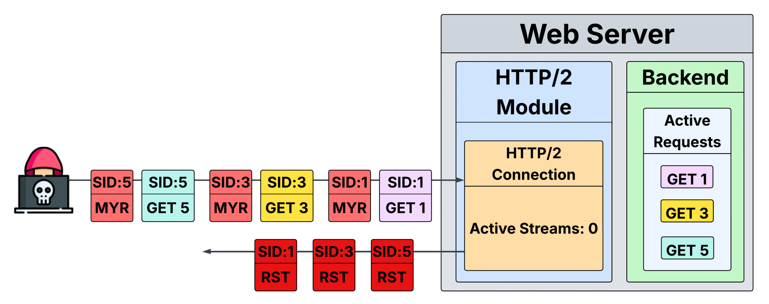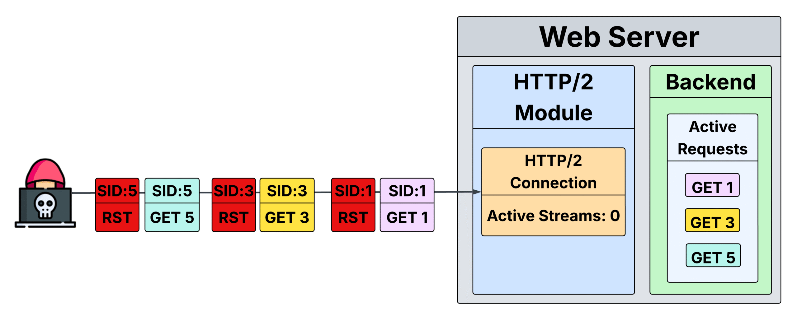 Mit anderen Worten: Ein Angreifer kann Stream-Abbrüche nutzen, um Server dazu zu bringen, Antworten auf eine unbegrenzte Anzahl gleichzeitiger Anfragen zu verarbeiten und zu berechnen, während er die durch das HTTP/2-Protokoll auferlegte Begrenzung MAX_CONCURRENT_STREAMS vollständig umgeht.
