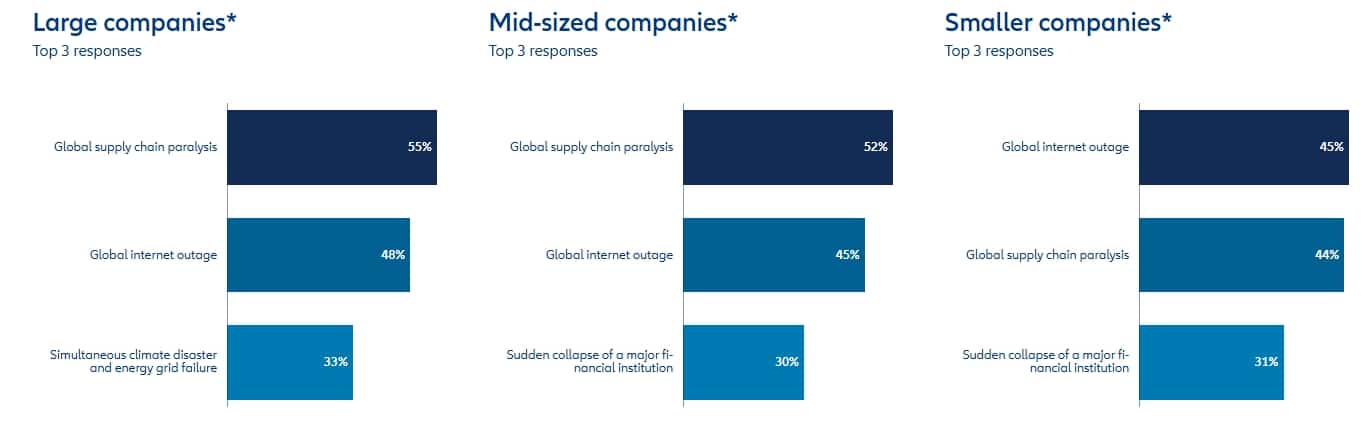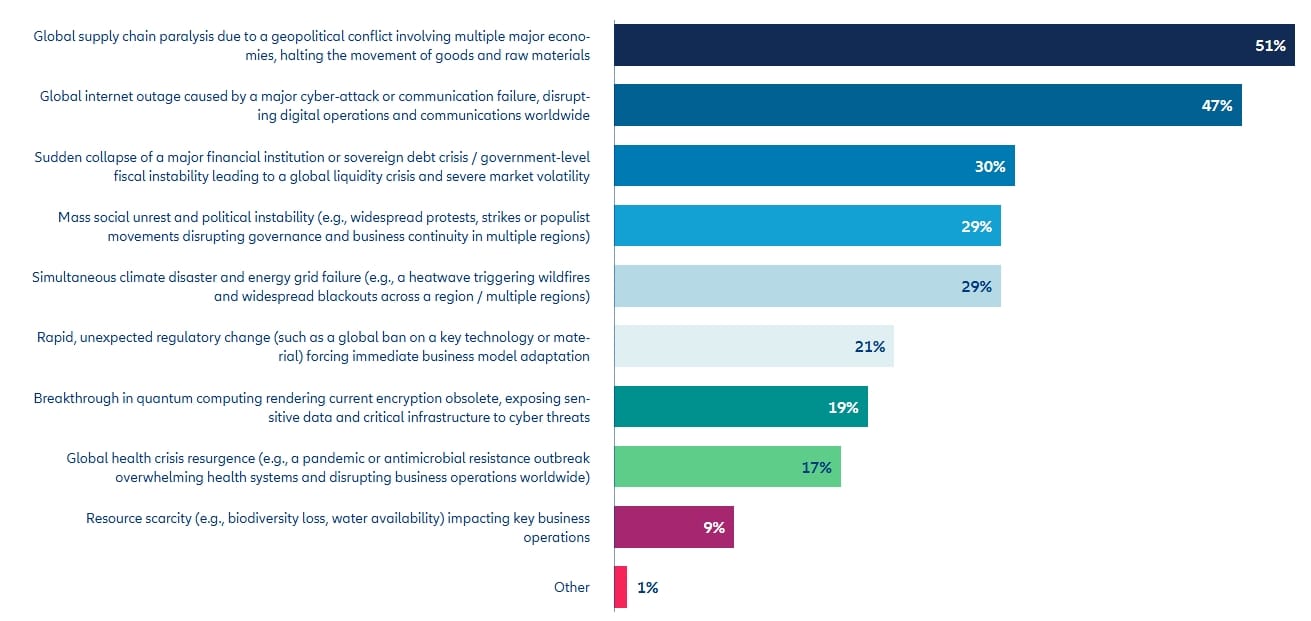 Vor diesem Hintergrund hat Allianz Research eine neue Analyse auf Basis des jährlichen Allianz Risk Barometer veröffentlicht. Mehr als 3.300 Unternehmensverantwortliche aus verschiedenen Branchen und Regionen wurden dabei befragt, welche Black-Swan-Szenarien sie für ihr Unternehmen in den kommenden fünf Jahren für am plausibelsten halten.