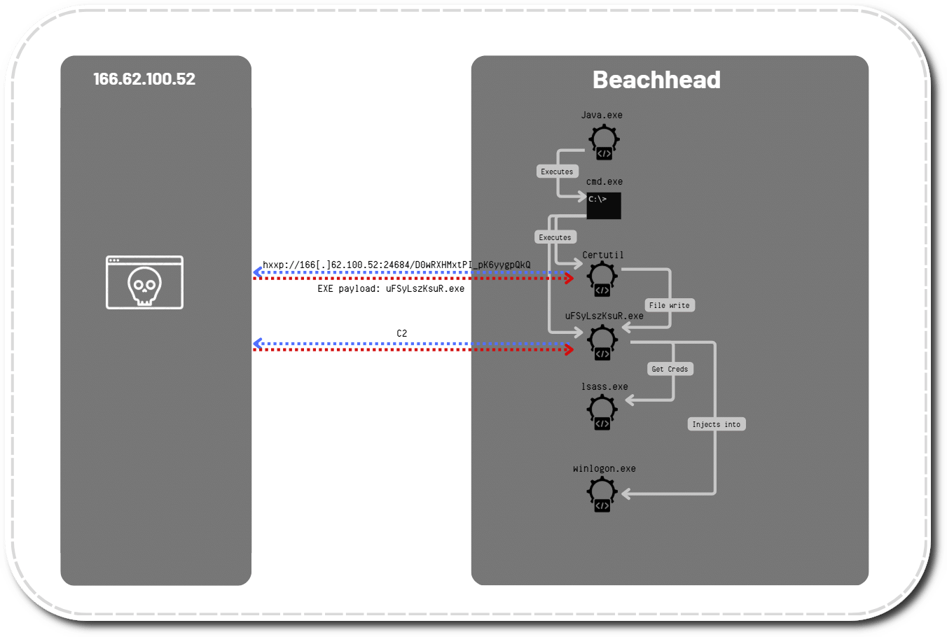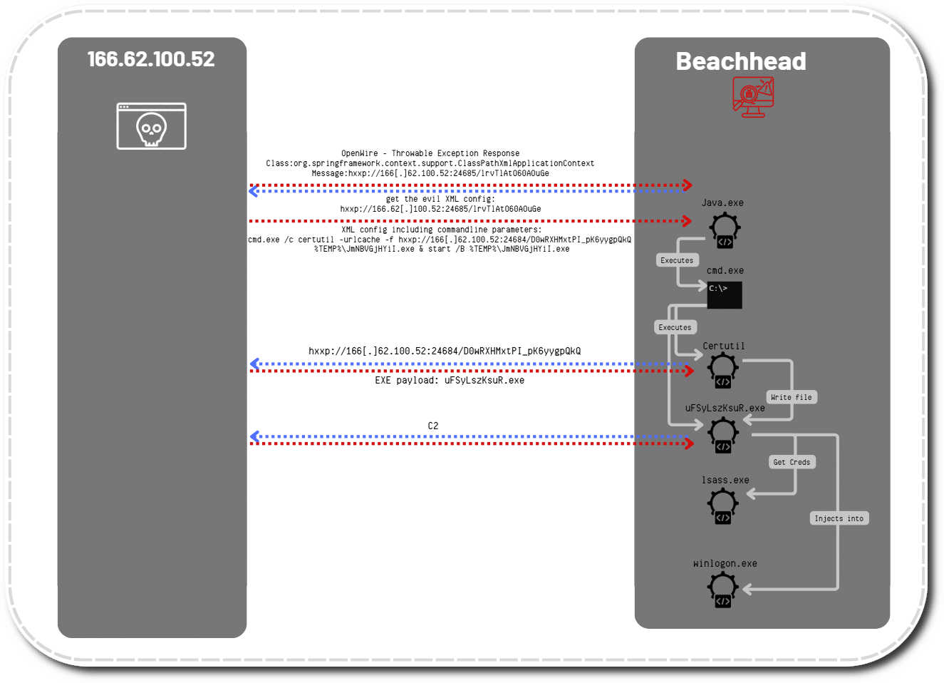 Im Februar 2024 kompromittierte ein unbekannter Angreifer einen Windows-Server, auf dem eine verwundbare Version von Apache ActiveMQ betrieben wurde. Grundlage war die Schwachstelle CVE-2023-46604, die eine Remote Code Execution (RCE) ermöglicht. Laut den Sicherheitsexperten übermittelte der Angreifer einen manipulierten OpenWire-Befehl an den Server und lud über die Java-Klasse ClassPathXmlApplicationContext eine bösartig präparierte XML-Konfigurationsdatei nach. Diese enthielt Anweisungen, die auf dem kompromittierten System ausgeführt wurden.