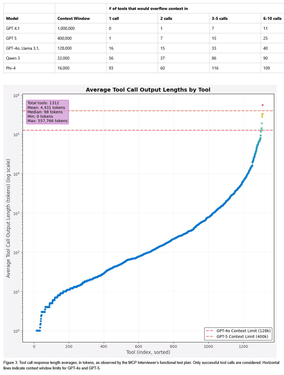 In der Analyse wurden 2.443 Tool-Aufrufe über 1.312 unterschiedliche Tools untersucht. Die Mehrheit erzeugte 98 oder weniger Tokens, doch einige Tools sind extrem „schwergewichtig“: Das Spitzen-Tool lieferte im Durchschnitt 557.766 Tokens – genug, um die Kontextfenster vieler beliebter Modelle wie GPT-5 zu überlasten. Weitere 16 Tools erzeugten mehr als 128.000 Tokens und überschreiten damit die Kapazitäten von GPT-4o und anderen Modellen. Selbst wenn die Antworten ins Kontextfenster passen, können übermäßig lange Outputs die Leistung um bis zu 91 % verringern und die Anzahl zukünftiger Aufrufe einschränken. Agenten können eigene Strategien zum Kontextmanagement implementieren, doch die MCP-Spezifikation definiert kein standardisiertes Verhalten, sodass Serverentwickler nicht auf ein einheitliches Clientverhalten zählen können.