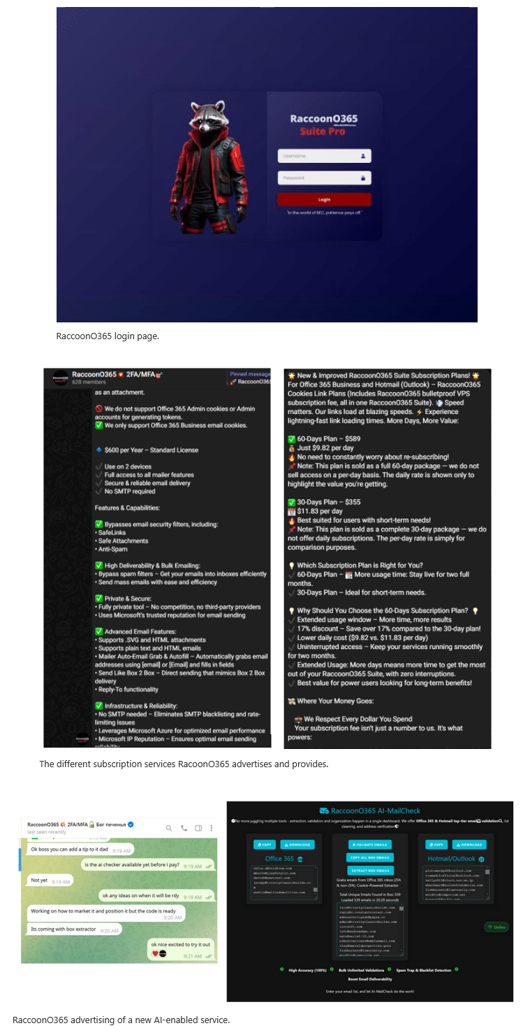 In nur etwas mehr als einem Jahr hat sich der Phishing-Dienst RaccoonO365 rasant weiterentwickelt und regelmäßig neue Updates veröffentlicht, um der steigenden Nachfrage gerecht zu werden. Dieses schnelle Wachstum macht deutlich, warum es jetzt notwendig ist, rechtliche Schritte gegen die Plattform einzuleiten. Nutzer von RaccoonO365 können täglich bis zu 9.000 Ziel-E-Mail-Adressen angeben und fortschrittliche Methoden einsetzen, um Multi-Faktor-Authentifizierung zu umgehen, Anmeldedaten zu stehlen und dauerhaften Zugriff auf die Systeme der Opfer zu erlangen. Kürzlich begann die Gruppe zudem, für einen neuen KI-gestützten Dienst zu werben: RaccoonO365 AI-MailCheck, der die Operationen weiter skalieren und die Effektivität der Angriffe steigern soll.