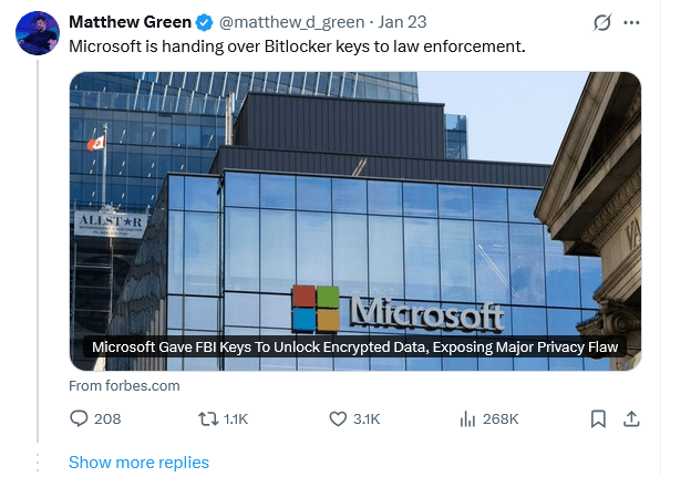 „ Wir schreiben das Jahr 2026, und diese Bedenken sind seit Jahren bekannt. Die Unfähigkeit von Microsoft, wichtige Kundenschlüssel zu sichern, macht das Unternehmen allmählich zu einem Ausreißer gegenüber dem Rest der Branche“, erklärte er. Microsoft erhält jährlich etwa 20 solcher Anfragen von Behörden, eine Zahl, die Experten zufolge nun stark ansteigen wird, da die Strafverfolgungsbehörden wissen, dass Microsoft diesen nachkommen wird. Matthew Green auf X