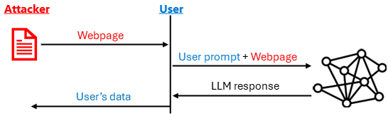 In einem typischen Szenario, wie in der Abbildung unten dargestellt, interagiert der Opferbenutzer möglicherweise mit einem LLM-basierten Dienst wie Microsoft Copilot und fordert das LLM auf, Text aus einer externen Quelle zu verarbeiten, beispielsweise um den Inhalt einer Webseite zusammenzufassen. Der externe Text (z. B. der Inhalt der Webseite) wird mit der Anweisung des Benutzers (d. h. der „Eingabeaufforderung” des Benutzers) verkettet und der kombinierte Text wird als Eingabe an das LLM übergeben. Wenn dieser extern stammende Text vom Angreifer kontrolliert würde, könnte er Text enthalten, den das LLM als Anweisungen missversteht. Diese Anweisungen könnten vor dem Benutzer verborgen sein, beispielsweise durch weiße Schrift auf weißem Hintergrund oder nicht druckbare Unicode-Zeichen. Die Prompt-Injection gilt als erfolgreich, wenn das LLM den Anweisungen des Angreifers „folgt”. Die möglichen Auswirkungen werden im nächsten Abschnitt erläutert.