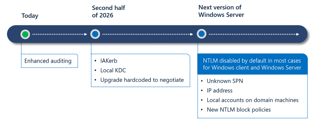 In der zweiten Jahreshälfte 2026 werden Lösungen für die häufigsten NTLM-Anwendungsfälle bereitgestellt. Dazu gehören Technologien wie IAKerb und das lokale Key Distribution Center (KDC), das sich derzeit in der Vorabversion befindet. Diese Komponenten ermöglichen Kerberos-Authentifizierung auch in Szenarien ohne direkte Verbindung zum Domänencontroller. Außerdem werden Windows-Kernkomponenten aktualisiert, sodass sie primär Kerberos aushandeln.