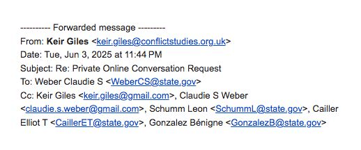 Abbildung 1: Keir Giles, ein bekannter britischer Russland-Experte, veröffentlichte diesen Screenshot eines E-Mail-Headers mit gefälschten E-Mails des US-Außenministeriums, die Teil einer UNC6293-Kampagne waren.