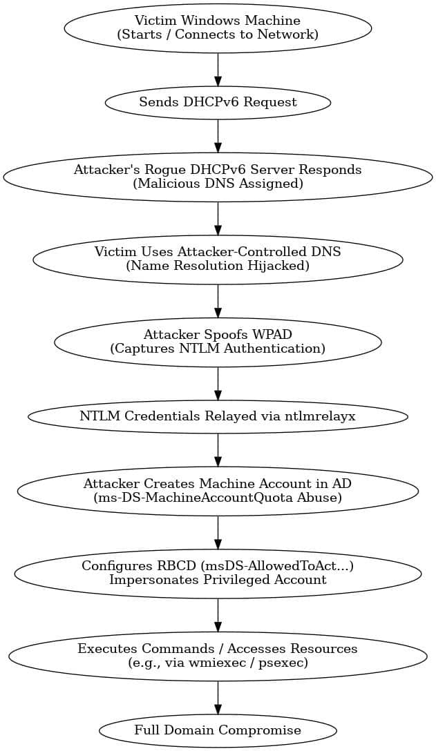 Durch das Zusammenspiel von gefälschten DHCPv6-Antworten, DNS-Poisoning, WPAD-Missbrauch und NTLM-Relay können Angreifer innerhalb kürzester Zeit von einem unprivilegierten Zugang bis hin zur vollständigen Domänenkontrolle eskalieren.