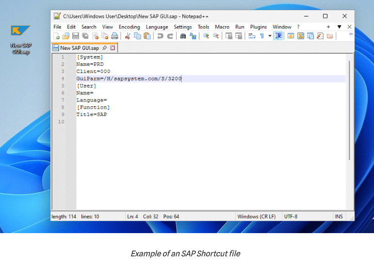 SAP-Verknüpfungen sind einfache Textdateien mit der Erweiterung .sap. Wenn Sie die SAP-GUI für Windows installieren, lernt das Betriebssystem, diese Erweiterung mit der SAP-GUI-Anwendung zu verknüpfen.