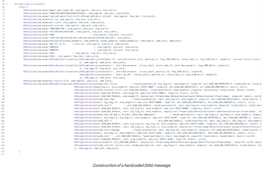 Die frühere Arbeit zu diesem Thema von Martin Gallo ist Open Source und kann ein guter Ausgangspunkt sein, um eine clientseitige Remote-Code-Ausführung über SAP-Shortcuts zu erreichen. Das Open-Source-Skript ist recht einfach: Es spielt DIAG-Meldungen mithilfe von Scapy-Klassen wieder. Das Skript erstellt beispielsweise eine fest codierte DIAG-Meldung für den Anmeldebildschirm, die normalerweise von einem legitimen SAP-Server gesendet würde: